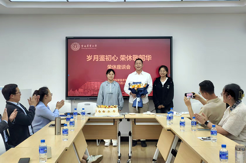 2025年9月19日,学院在二楼会议室为杨振生老师举行荣休座谈会。会议由学院党委书记李世俊主持,学院党政领导班子成员、教师代表及学生代表参加会议。