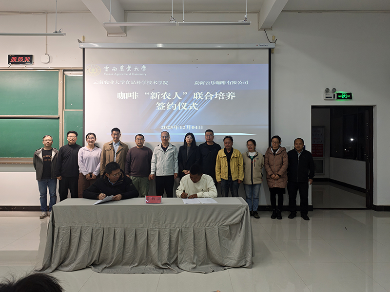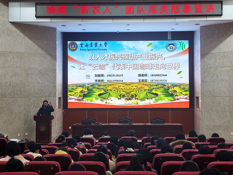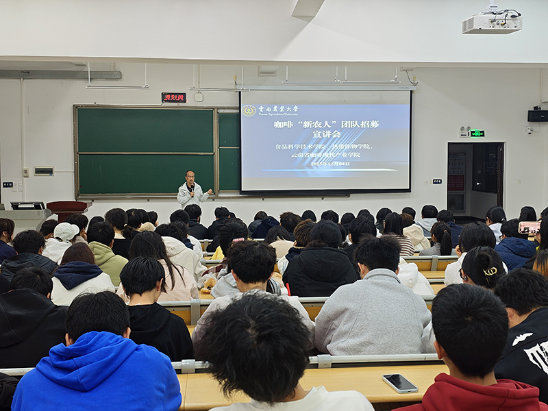 为推进《云南农业大学关于加快培育扎根乡村一线“新农人”工作实施方案 》的工作部署,把“云南咖啡还是代表着中国的”落实到教育科技人才一体化建设上,2025年12月4日-7日,我校副校长、咖啡科学与工程专业负责人李宏带队,食品科学技术学院牵头,联合热带作物学院、云南省咖啡现代产业学院,分别在校本部、普洱校区开展咖啡“新农人”团队招募宣讲、面试活动,全校450余名同学参加了宣讲会,参会同学涉及咖啡、食品、林学、经管、大数据等专业。宣讲会互动环节气氛热烈,同学们就选拔标准、课程设置、发展路径等关切问题踊跃提问,与会老师均给予了详尽解答,同学们反响热烈、会后报名踊跃。其间,食品科学技术学院分别与勐海云乐咖啡有限公司、临沧秋珀庄园有限公司、保山比顿咖啡有限公司等3家企业签订了咖啡“新农人”联合培养协议,以及云南农业大学“新农人”实践教学基地培养协议。