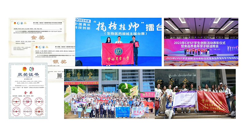 学科竞赛成绩突出,发挥“以食育人”特色,利用大学生科研训练计划(SRTP)、科教管融合,有组织的提前谋划、指导、孵化。挑战杯获得国家级金奖1项、国家级银奖1项、省级金奖2项;“互联网+”大学生创新创业大赛,获国家级银奖1项、省级金奖14项、银奖8项、铜奖7项;大学生创新创业训练计划共获得国家立项11项,省级立项13项。学生团队研发的咖啡精酿啤酒等作品荣获多项国家级奖项。学院连续4年获得校级“五四红旗团委”荣誉称号,连续3年学生工作考核“优秀”。组织“党员技术服务团”,深入产区开展技术培训,覆盖农户5000余人次,培育产业带头人120名。“三下乡”大学生社会实践获得省级先进团队1支,校级先进团队6项,引导学生在科研训练和社会服务中增长才干。毕业生就业升学质量稳步提升,服务国家战略和基层一线的比例持续提高,为国家和区域发展培养了大批具有家国情怀与专业本领的食品行业生力军。